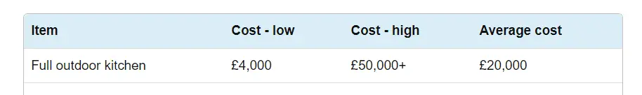 It is also the hardest to answer because it really does all depend on the clients desires and needs from an outdoor kitchen. BUT this table was put together by Checkatrade showing that full outdoor kitchens tend to begin at roughly £4,000 and can range anything up to £50,000+.