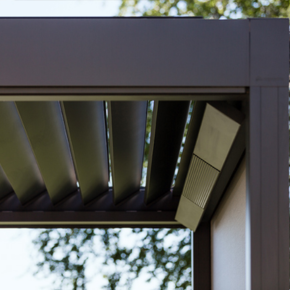 Lineo Heat is a fixed louvre that is fitted to replace one of the standard rotating louvres in a pergola. One or two infrared heating elements are seamlessly integrated into this louvre, and the electrical wiring is invisibly concealed. The result is a sleek louvered roof with pleasant and instant heat as an extra benefit.