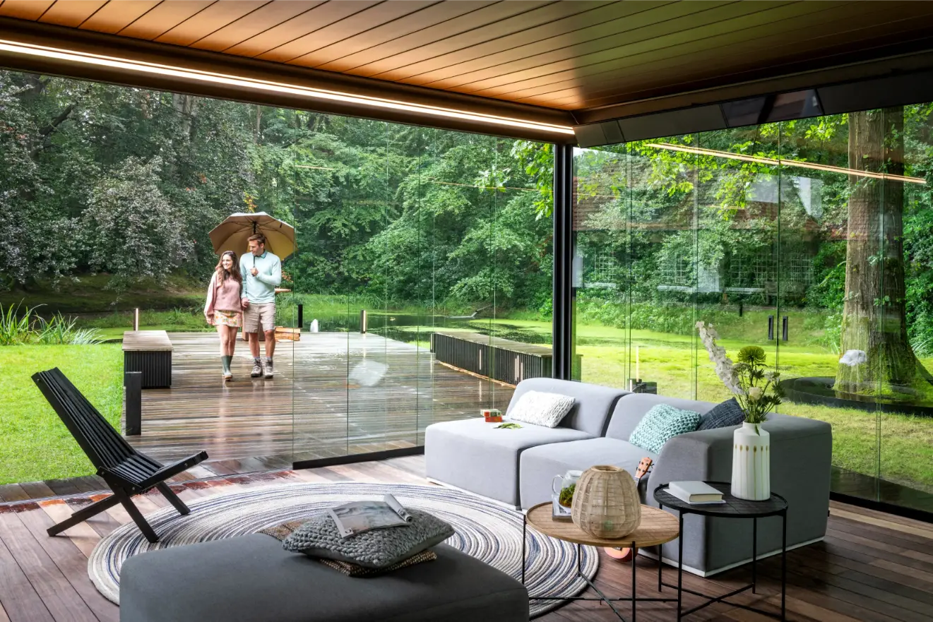 For added comfort, the Camargue can be customised with sliding glass panels, Loggia panels, or Fixscreens® — offering privacy, wind protection, and year-round usability. Integrated heating, sound, and LED lighting create a warm and inviting atmosphere well into the evening.